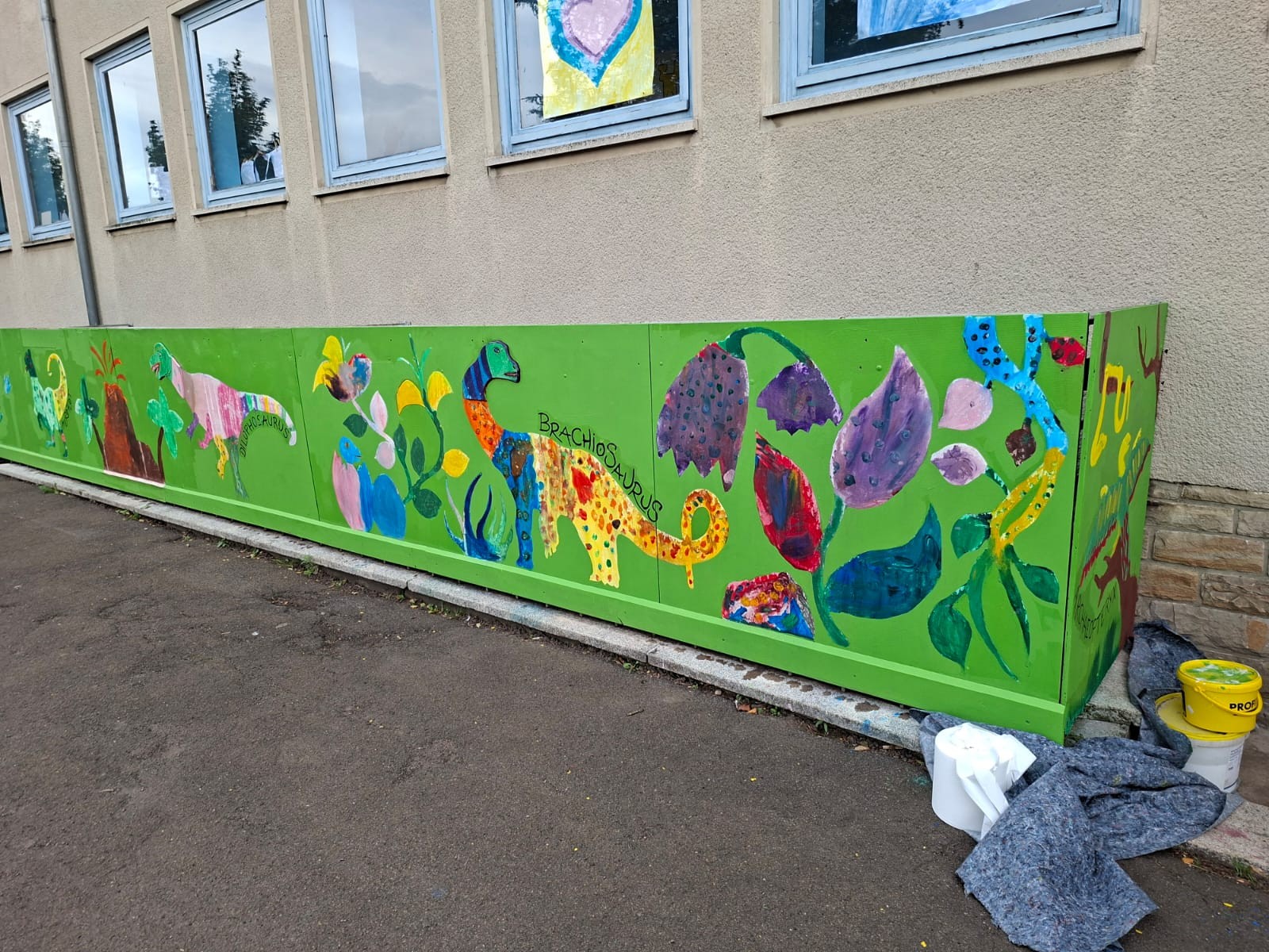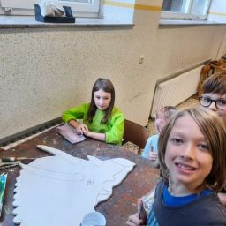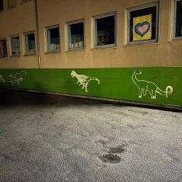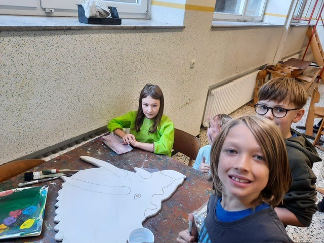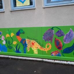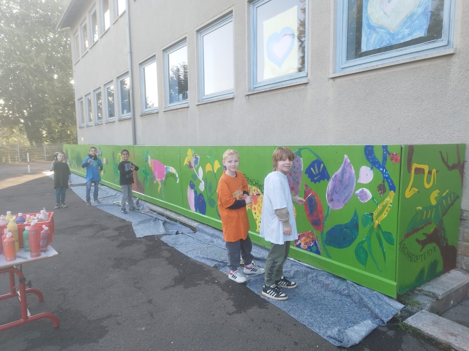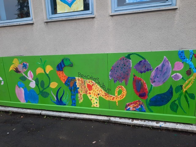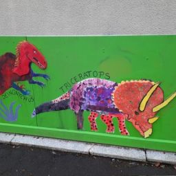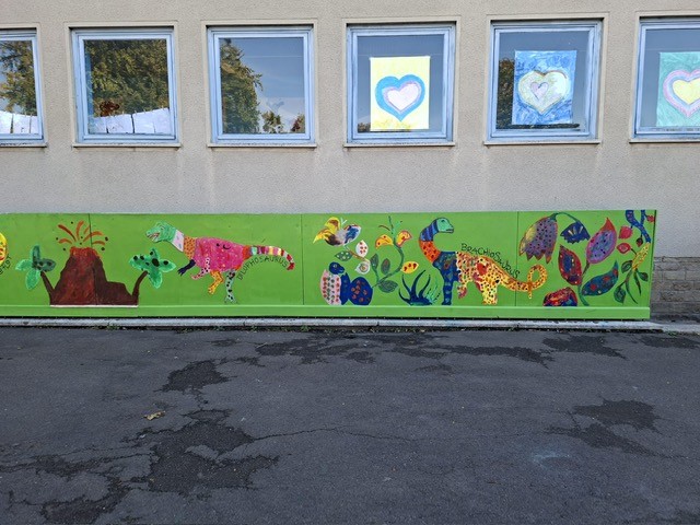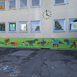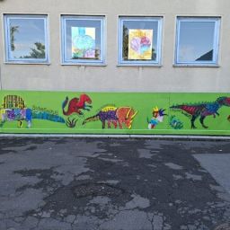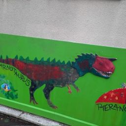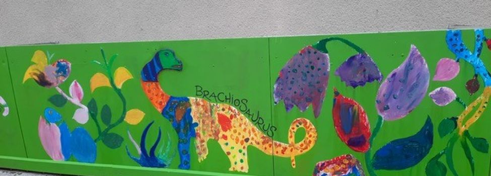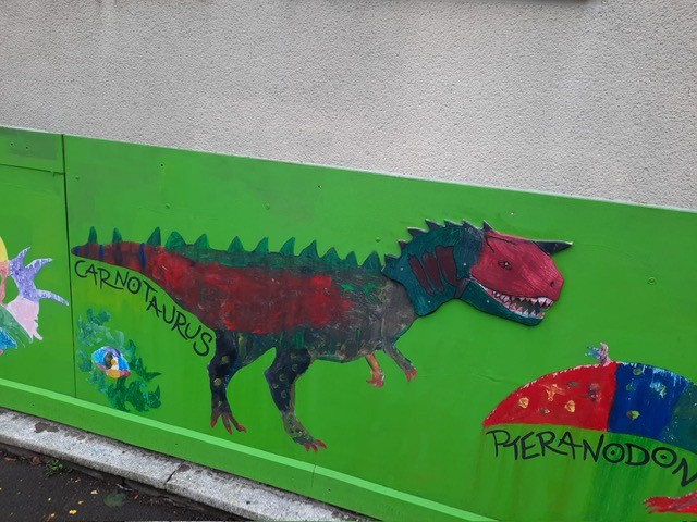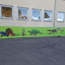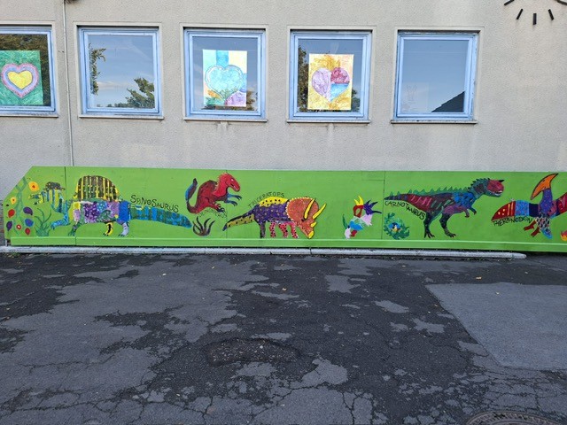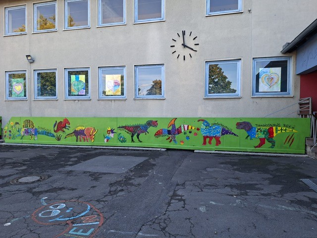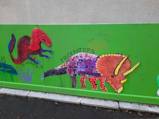 Der Plan war gut, die Durchführung jedoch ziemlich aufwändig. Zuerst musste der Bretterzaun grundiert werden. Danach wurden die Umrandungen der Dinosaurier mit Hilfe vom Beamer am Abend an den Zaun gestrahlt und gezeichnet. Auch die Dinosaurier mussten nun zunächst grundiert und vorbereitet werden, sodass die Kinder sie dann farbenfroh und individuell ausgestalten konnten. Es hat allen Beteiligten sehr viel Freude bereitet, war jedoch auf Hausmeisterseite mit viel zusätzlicher Arbeit verbunden, die dieser nicht scheute. Elisa wurde von ihrer Freundin Maria unterstützt und nahm sich auch Zeit mit den Kindern der 4c und Frau Arnsmeyer im Kunstunterricht die Dinosaurierköpfe nochmal extra zu gestalten. Diese wurden im Vorfeld von ihr vorgezeichnet und widerum von Stefan Berg ausgesägt, sodass sie dann final die Löcher der Bretterwand schließen konnten.