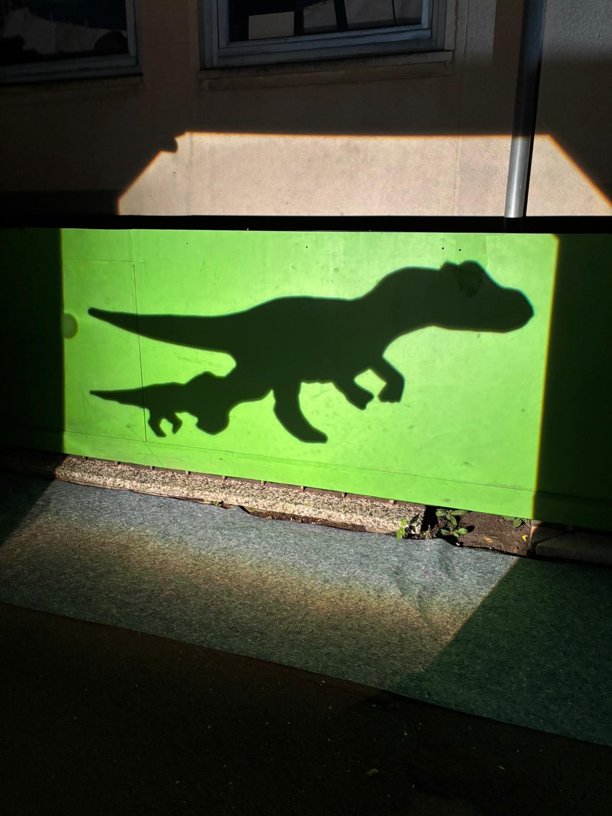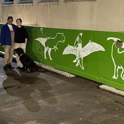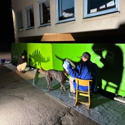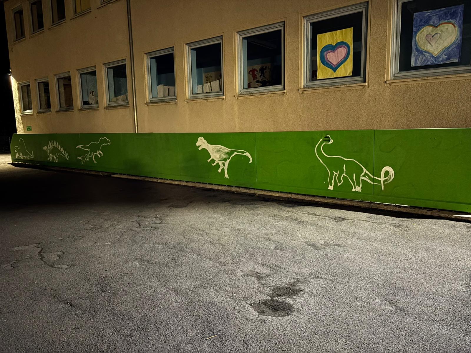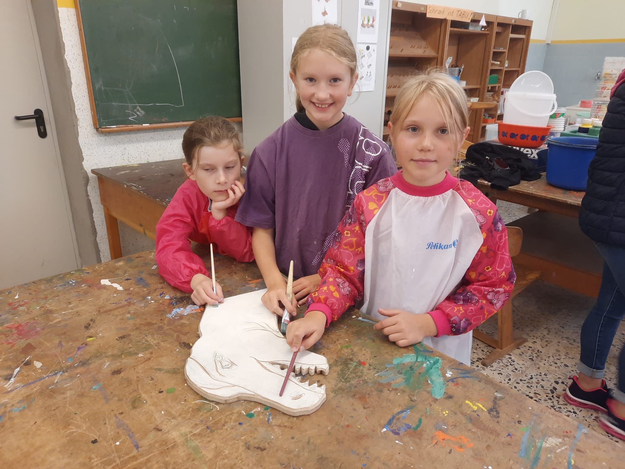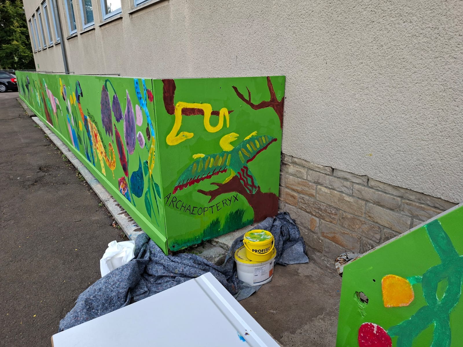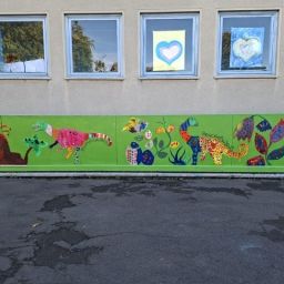 Der Plan war gut, die Durchführung jedoch ziemlich aufwändig. Zuerst musste der Bretterzaun grundiert werden. Danach wurden die Umrandungen der Dinosaurier mit Hilfe vom Beamer am Abend an den Zaun gestrahlt und gezeichnet. Auch die Dinosaurier mussten nun zunächst grundiert und vorbereitet werden, sodass die Kinder sie dann farbenfroh und individuell ausgestalten konnten. Es hat allen Beteiligten sehr viel Freude bereitet, war jedoch auf Hausmeisterseite mit viel zusätzlicher Arbeit verbunden, die dieser nicht scheute. Elisa wurde von ihrer Freundin Maria unterstützt und nahm sich auch Zeit mit den Kindern der 4c und Frau Arnsmeyer im Kunstunterricht die Dinosaurierköpfe nochmal extra zu gestalten. Diese wurden im Vorfeld von ihr vorgezeichnet und widerum von Stefan Berg ausgesägt, sodass sie dann final die Löcher der Bretterwand schließen konnten.