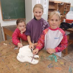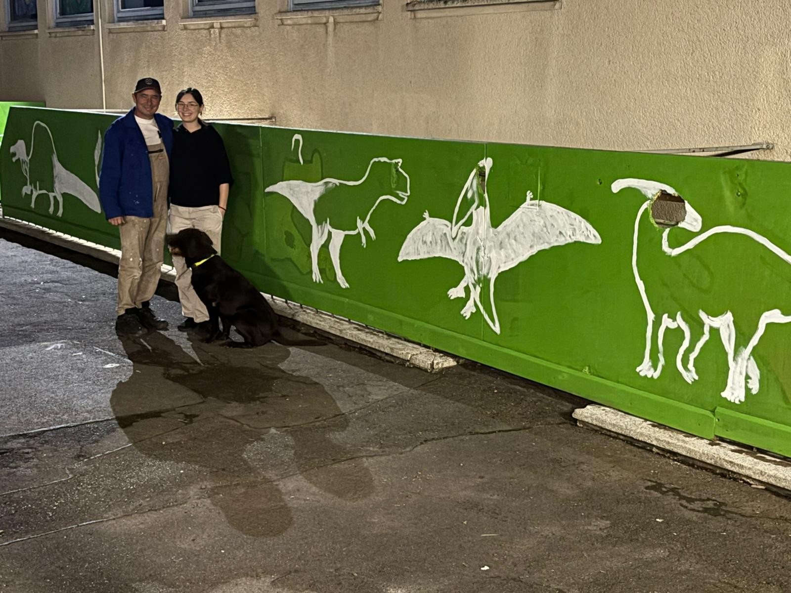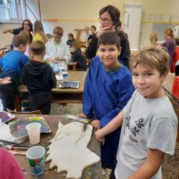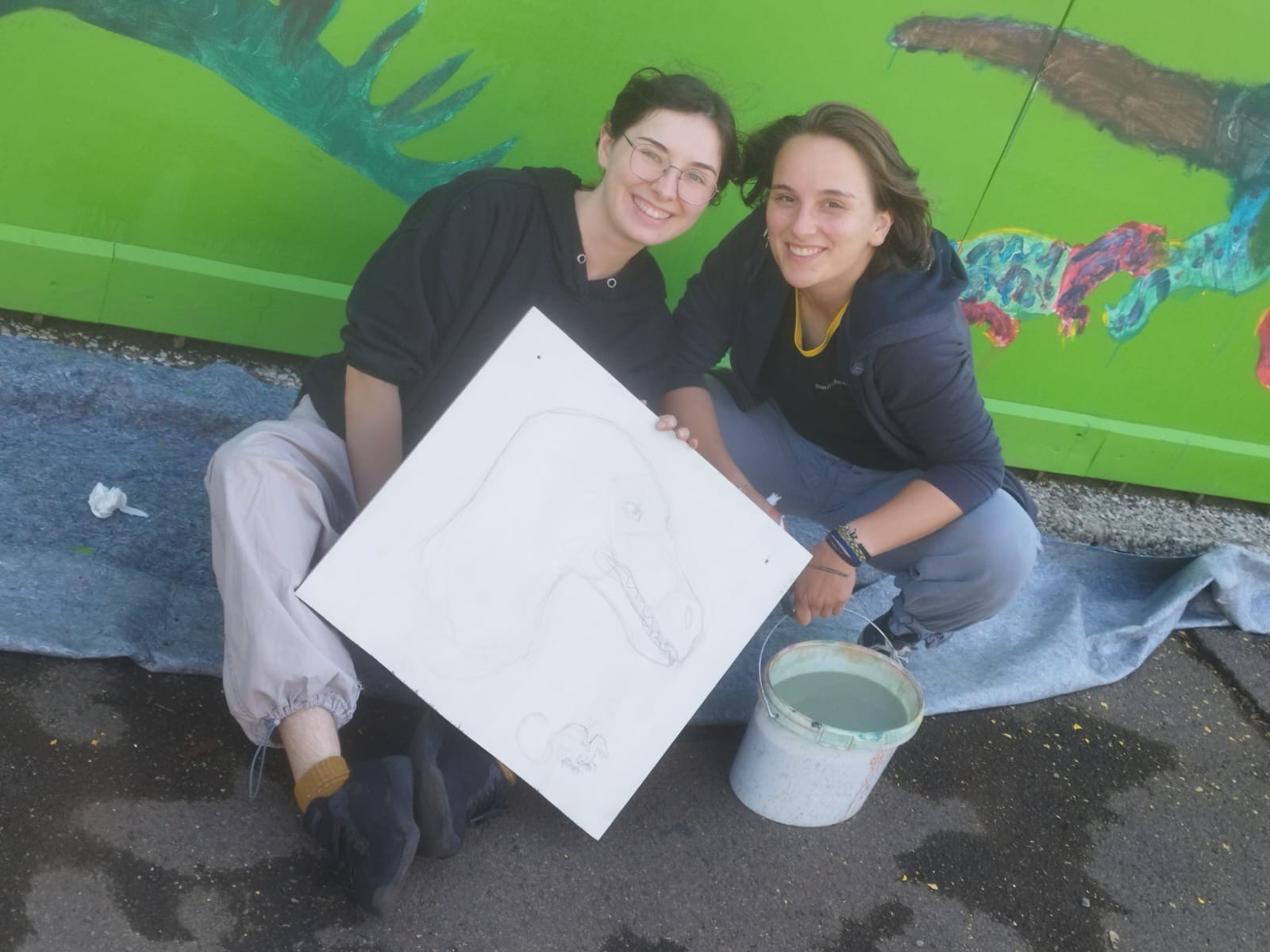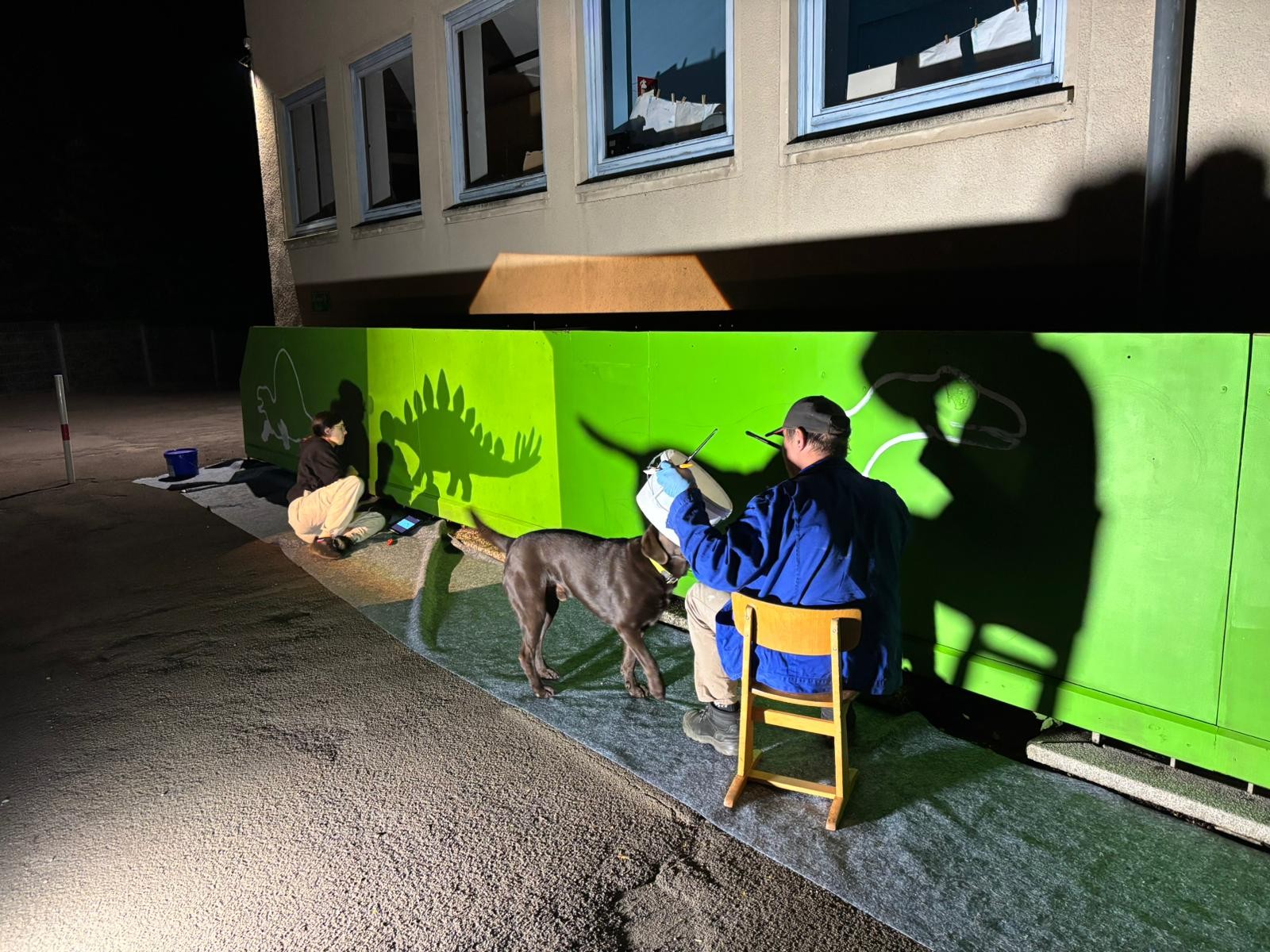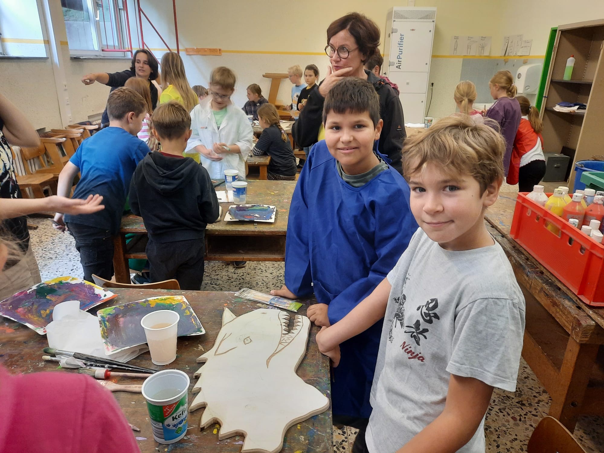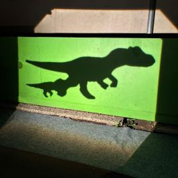 Der Plan war gut, die Durchführung jedoch ziemlich aufwändig. Zuerst musste der Bretterzaun grundiert werden. Danach wurden die Umrandungen der Dinosaurier mit Hilfe vom Beamer am Abend an den Zaun gestrahlt und gezeichnet. Auch die Dinosaurier mussten nun zunächst grundiert und vorbereitet werden, sodass die Kinder sie dann farbenfroh und individuell ausgestalten konnten. Es hat allen Beteiligten sehr viel Freude bereitet, war jedoch auf Hausmeisterseite mit viel zusätzlicher Arbeit verbunden, die dieser nicht scheute. Elisa wurde von ihrer Freundin Maria unterstützt und nahm sich auch Zeit mit den Kindern der 4c und Frau Arnsmeyer im Kunstunterricht die Dinosaurierköpfe nochmal extra zu gestalten. Diese wurden im Vorfeld von ihr vorgezeichnet und widerum von Stefan Berg ausgesägt, sodass sie dann final die Löcher der Bretterwand schließen konnten.